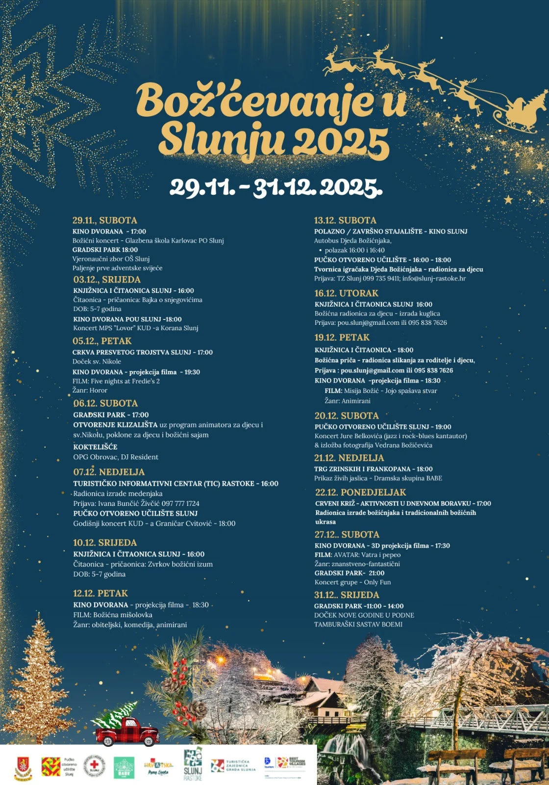 Za djecu i obitelji pripremljene su pričaonice u knjižnici, kreativne radionice, izrada medenjaka, likovne igraonice, radionice izrade božićnjaka i tradicionalnih ukrasa, kao i fantastični autobus Djeda Božićnjaka koji vozi izravno u maštu. Tu su i žive jaslice ispred crkve — jedan od onih prizora koji se pamti dugo.